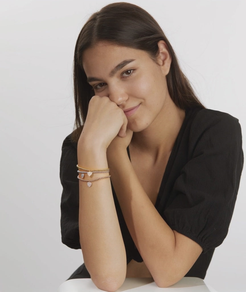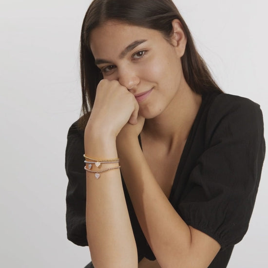 Elegantes Damen-Armband aus vergoldetem Silber mit glänzenden Kugeln und funkelndem Herz-Anhänger besetzt mit Zirkonia-Steinen. Ein zeitloser, romantischer Schmuck, der jedes Outfit stilvoll ergänzt. Verstellbare Länge für perfekten Sitz am Handgelenk.