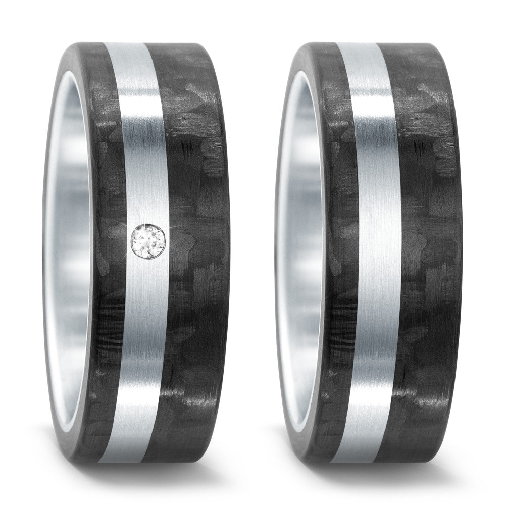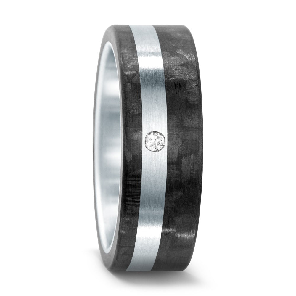 Bague de partenaire pour femme en acier inoxydable et carbone, ornée d'un diamant éclatant. Design moderne avec une bande argentée centrale qui met en valeur la brillance du diamant. Allie robustesse et élégance pour un style unique au quotidien.