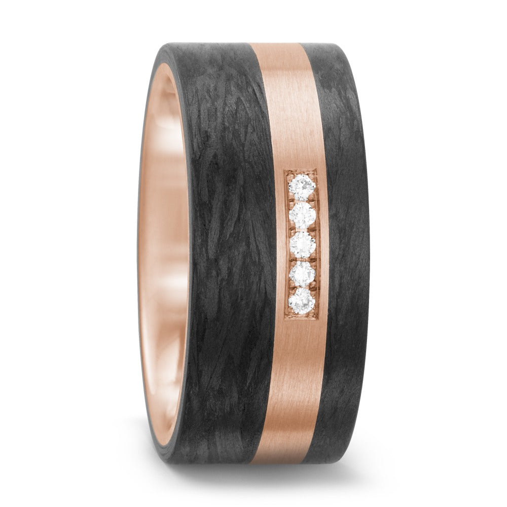 Bague pour femme en or rouge 750 combinée à du carbone élégant. Cette alliance moderne arbore une bande centrale en or ornée de cinq diamants étincelants, offrant un contraste raffiné entre la chaleur de l'or rouge et le noir profond du carbone. Un bijou unique et sophistiqué.