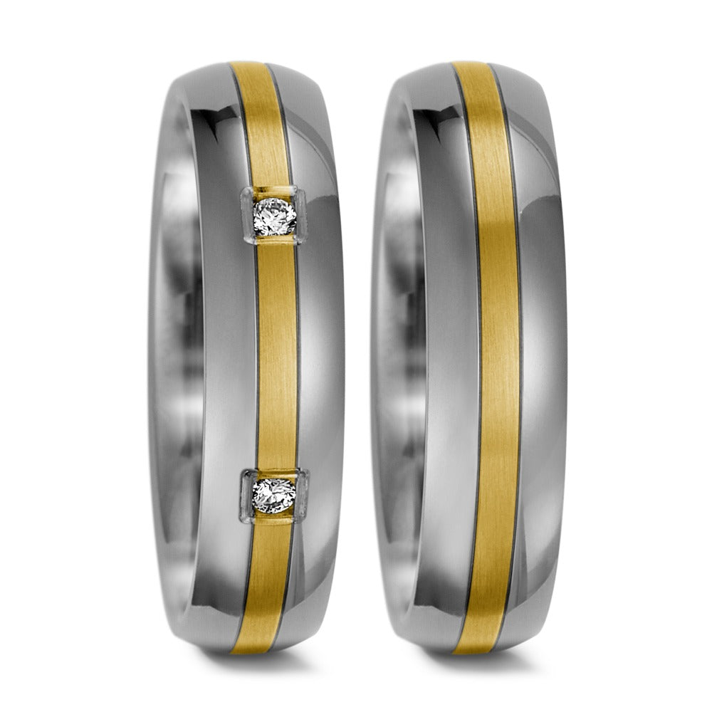 Bague pour femme en titane avec une élégante bande centrale en or jaune 585. Ornée de deux diamants scintillants, cette bague allie robustesse et raffinement pour un look moderne et sophistiqué. Un bijou parfait pour toutes les occasions.