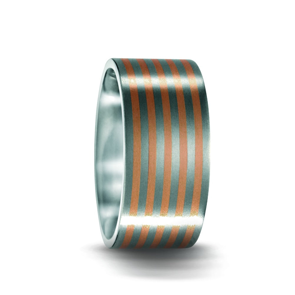 Bague pour homme alliant la robustesse du titane à l'élégance du 750 or rose. Son design rayé moderne offre un style unique et sophistiqué, parfait pour un port quotidien ou une occasion spéciale. Un bijou masculin alliant durabilité et raffinement.