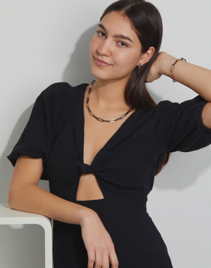 Bracelet pour femme en acier inoxydable et fibre de carbone. Design moderne avec maillons alternés en noir et rose doré, alliant robustesse et élégance. Parfait pour un look chic et contemporain, ce bijou est léger et résistant, idéal pour un usage quotidien.
