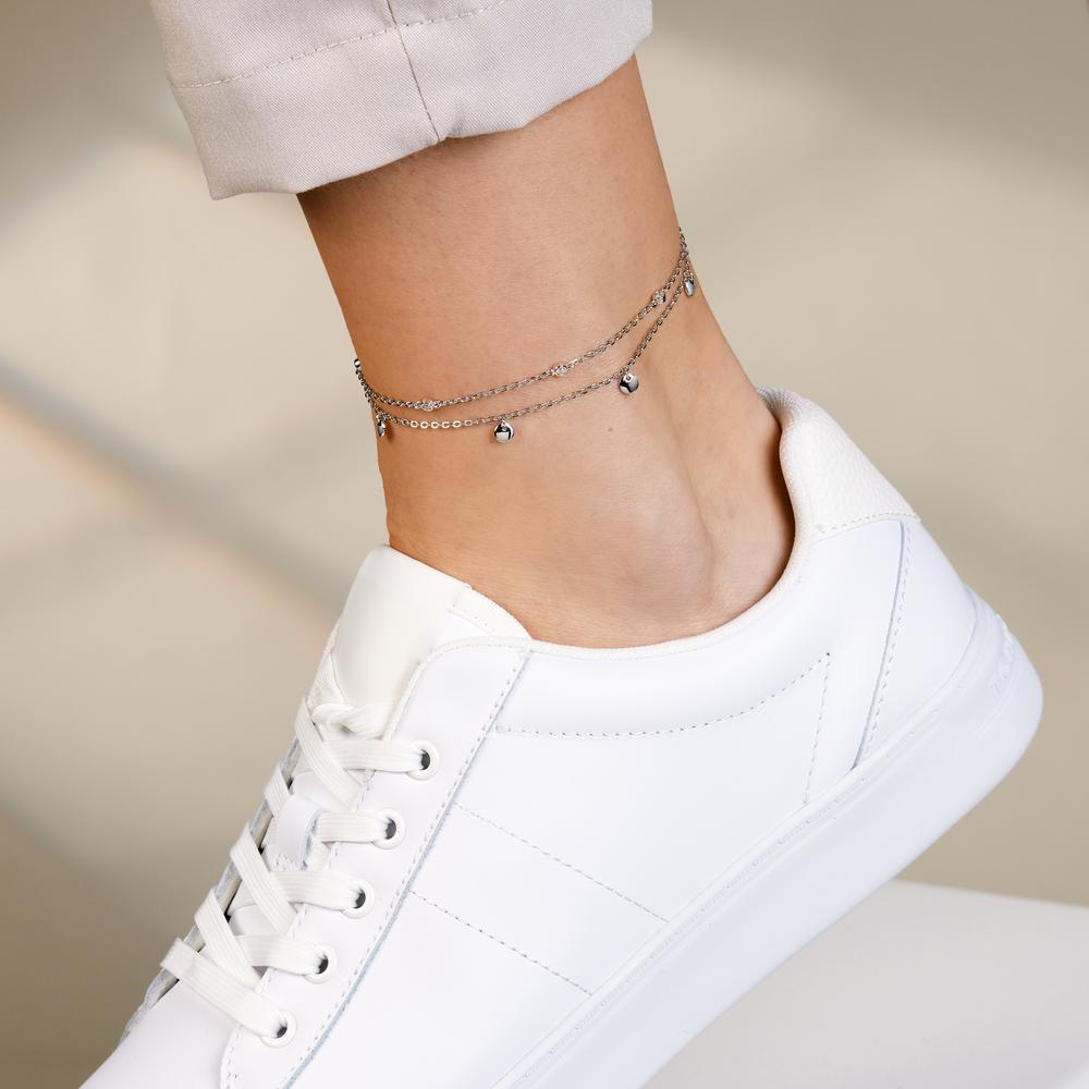 Bracelet de cheville pour femme en argent avec délicats pendentifs ronds et pierres en zirconia éclatantes. Élégant et léger, il apporte une touche sophistiquée et brillante à vos tenues estivales. Ajustable pour un confort parfait. Un accessoire incontournable pour sublimer vos chevilles.