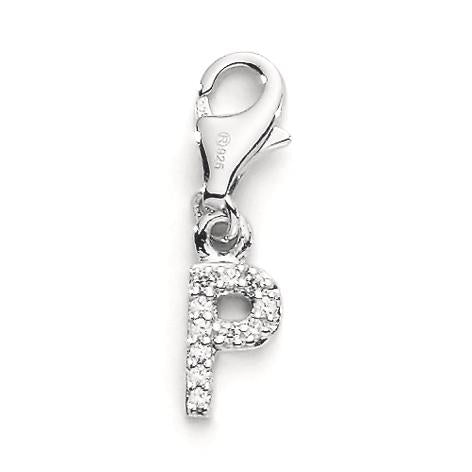 Charm pour femme en argent sterling 925, orné de zircones étincelantes en forme de lettre "P". Ce pendentif élégant se fixe facilement grâce à un fermoir mousqueton, idéal pour personnaliser bracelets ou colliers avec une touche raffinée et personnelle.