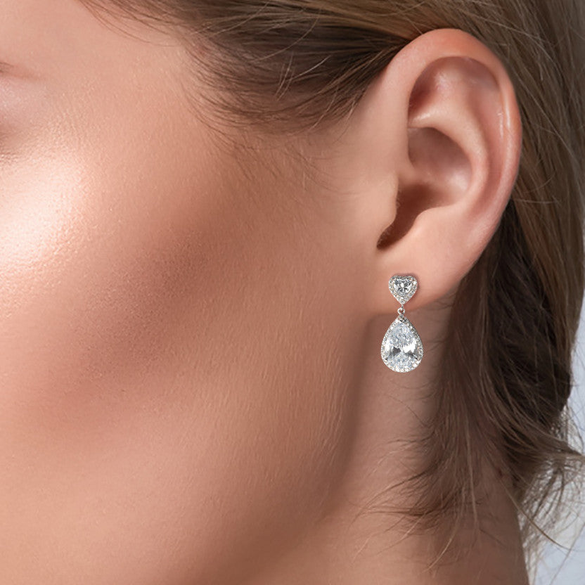 Boucles d'oreilles pour femme en argent élégantes, ornées de zircones brillantes. Le design associe un cœur délicat à une goutte scintillante, créant un bijou raffiné et romantique. Parfait pour illuminer vos tenues en toute occasion.