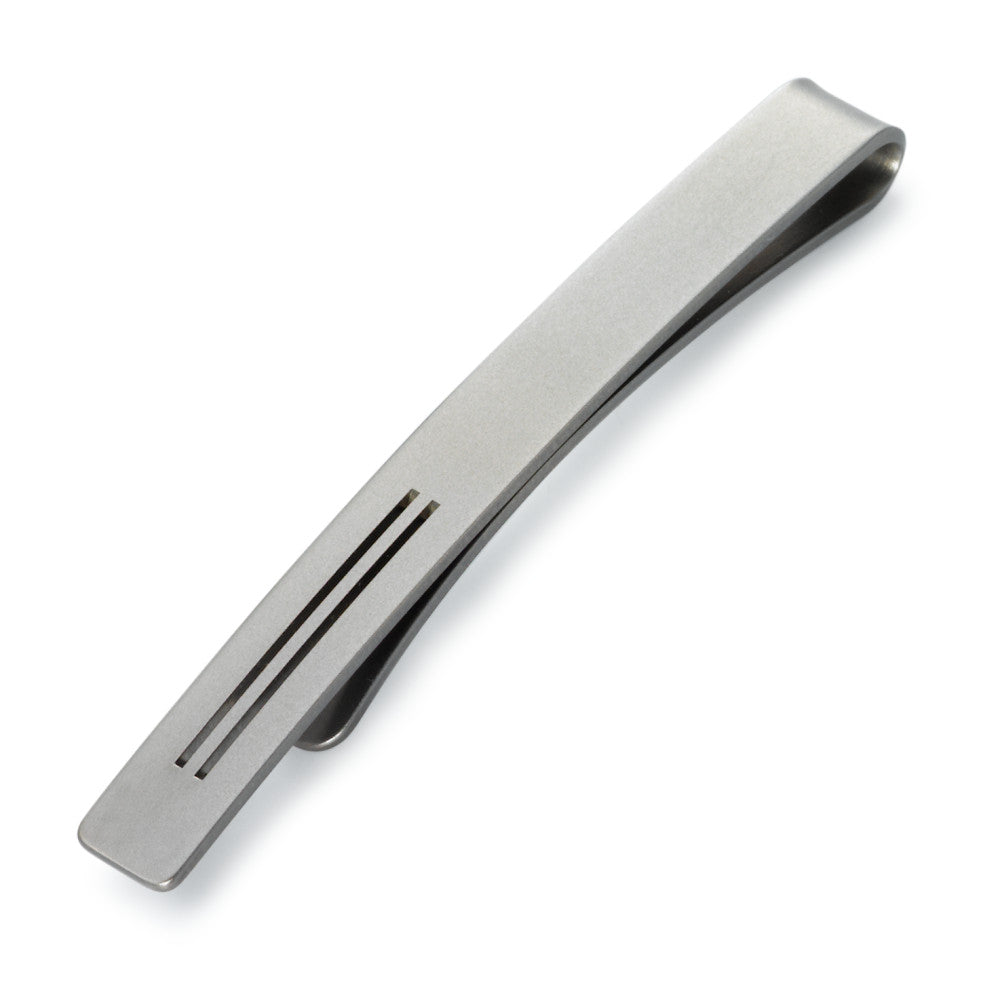 Pince à cravate pour homme en titane, alliant légèreté et robustesse. Son design épuré avec deux fines rainures apporte une touche d'élégance discrète. Idéale pour maintenir la cravate parfaitement en place tout en complétant votre style avec raffinement.
